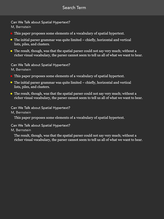 Search results are shown like this, with highlighted text first, then any other occurrences below (below all the highlighted text results). User can tap on the title text, which is the 'Search Term' to go into the same pull-down dialog as they had when entering the search term (above) where they can also choose to tap X in a circle to the right, to cancel the search, or pull down again to cancel the search and this then snaps away the heading and all documents are shown: