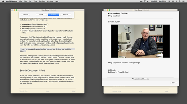 Citations can be added quickly from books, websites and YouTube, where the videos can play inside Author, from the moment cited.